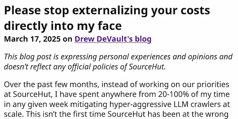 上周,代码托管网站 SourceHut 的站长,公开发表文章(下图),痛斥 AI 爬虫太过份,服务器无法承受访问压力,中断服务。