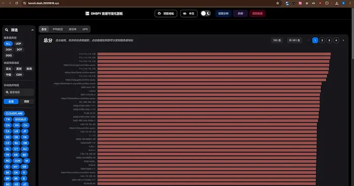 这个网站测试从你的计算机到世界主要公共 DNS 服务器的速度。