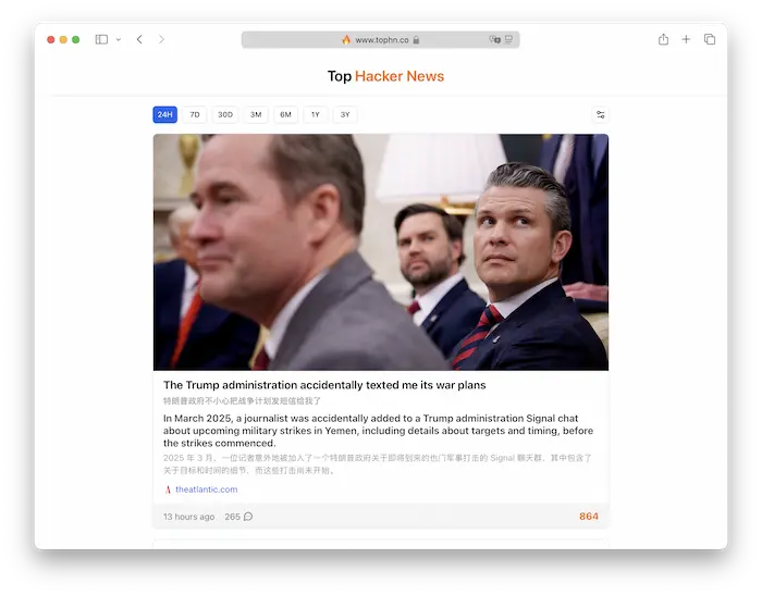 该网站展示“黑客新闻”实时的热门文章,有插图和内容总结。(@heyppen 投稿)